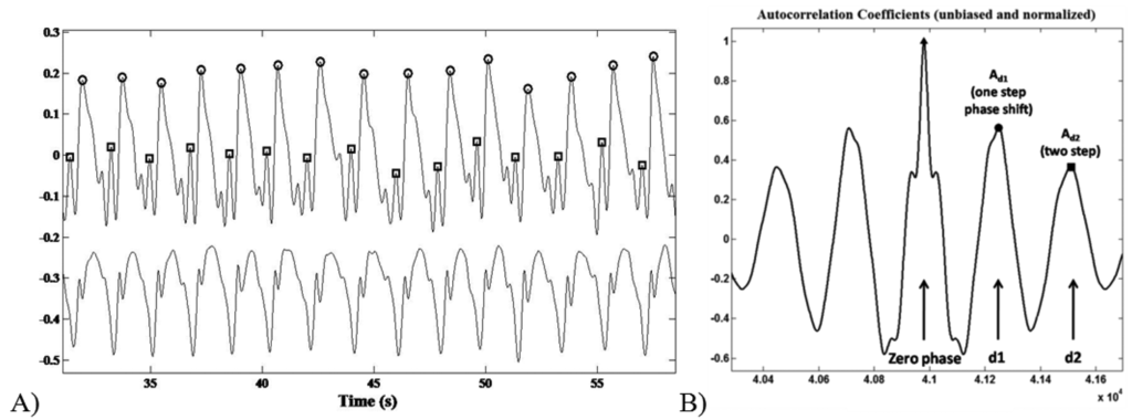 As previously reported by Moe-Nilssenet et al., [32], since the first dominant period represents a phase shift of one step (d1), the autocorrelation coefficient at the first dominant period Ad1 is an expression of the regularity of the acceleration signal between neighbouring steps (Figure 4B). Hence, we performed a regularity/symmetry analysis on the acquired step acceleration pattern, in which for the vertical axis closeness of each of Ad1 and Ad2 to 1.0 reflects step and stride regularity, respectively, while closeness of Ad1/Ad2 to 1.0 reflects symmetry. On the contrary, for the ML axis, Ad1 ∼ −1 and Ad2 ∼ 1 represents the step/stride regularity, whereas Ad1/Ad2 ∼ −1 shows the step symmetry.