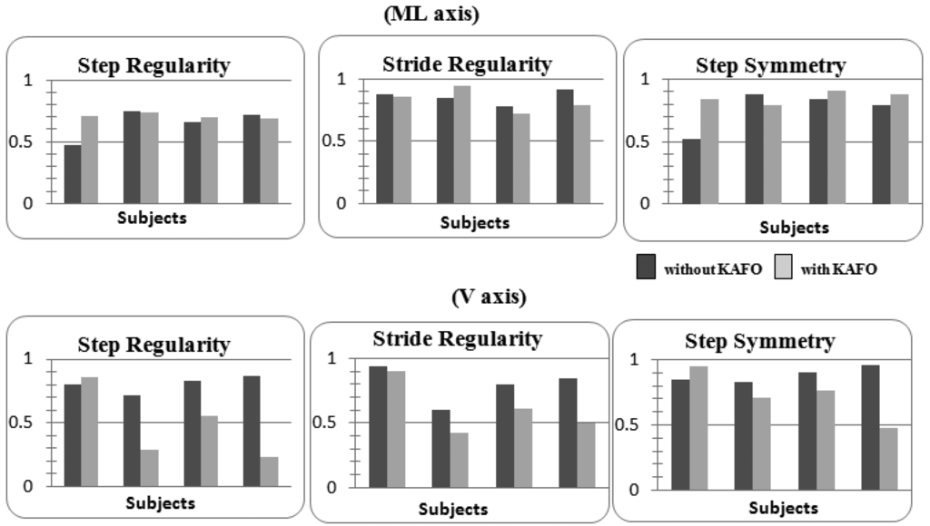 The histograms with the inferred values for step/stride regularity and symmetry were reported both for the ML and V axes (Figure 5). In the ML axis we focused our attention on the recovery of a symmetrical gait that is important for reducing both impact forces on the Post-Polio limb and postural corrections during gait. For the ML axis, subject 1 showed an increased step regularity (+34%) whereas the other subjects manifested lower performance variations (less than 10%, so we can consider it as constant in the other patients). Step symmetry is significantly increased (+38% in subject 1, about 10% in subjects 3 and 4) while wearing the orthosis in three subjects, while patient 2 presents a 10% reduction. This result was also backed by the step symmetry/regularity evaluation on the V axis, in which subject 1 showed the same improvement (although with a lower percentage) with respect to the other subjects that highly decreased step/stride regularity (between 30% and 73%) and symmetry (between 12% and 48%). This reduction of step regularity was probably due to the new orthosis they were asked to wear; so they needed to get acquainted to the new situation and should be recovered during training.