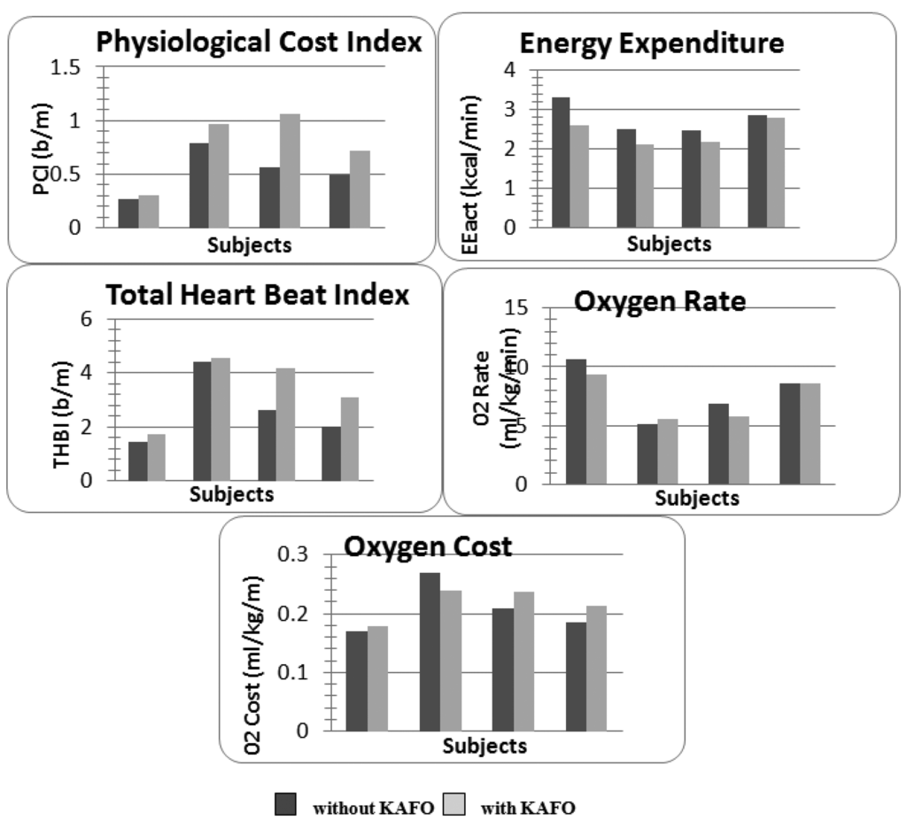 In this study we wanted to provide a comprehensive vision of the human-orthosis system both from biomechanical and metabolic (energetic) point of view. For this reason we tried to find a specific index concerning this second aspect, but in literature we did not succeed in finding a solution directly applicable in our case study. Thus our methodological choice, in accordance to the clinicians' suggestion, was to consider the different indexes reported in literature to assess motor capabilities and compatible (for their computation with the adopted experimental setup. Metabolic indexes were derived by the unobtrusive measures provided by the polygraph, without the use of direct/indirect calorimetric measurements or respiratory gas analysis. In particular, the following indexes were estimated: