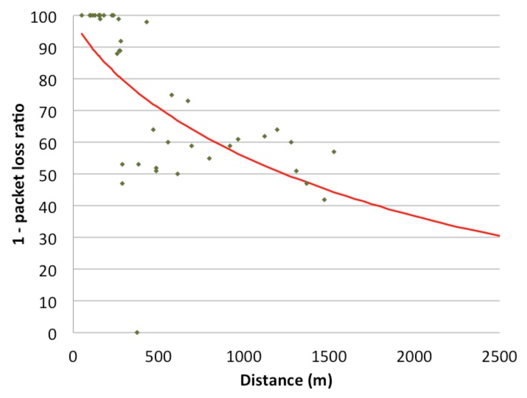 To compute the metric based on this distance, u1,i, we use Expression (3), where di is the previous Euclidean distance and dref is a reference distance, above which losses start to increase notably faster. This dref is obtained from simulations where we evaluated the performance of a fixed node set in different distances from the AP. The results are presented in Figure 1, where we can see that dref is around 2,000 m in our urban scenario. Notice that for a transmission range of 250 m, such a path of around 2,000 m would take around eight hops. α is an attenuation factor that equals 0.77, obtained after a mathematical regression using the results of the simulations mentioned before and shown in Figure 1. This value, represented in Figure 1, measures the utility of the metric of the distance. Consequently, low distances to the destination obtain a high benefit, while long distances to the destination obtain low profits. The main settings used in this evaluation are presented in Table 3.