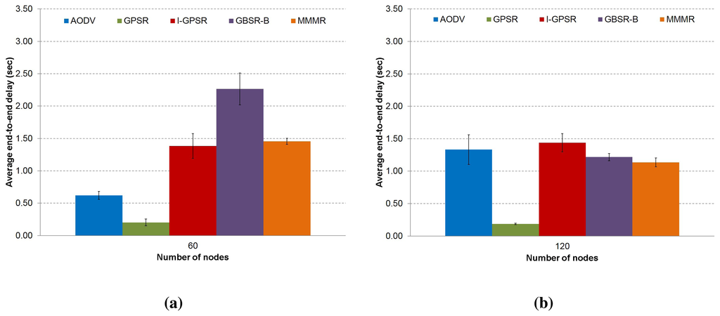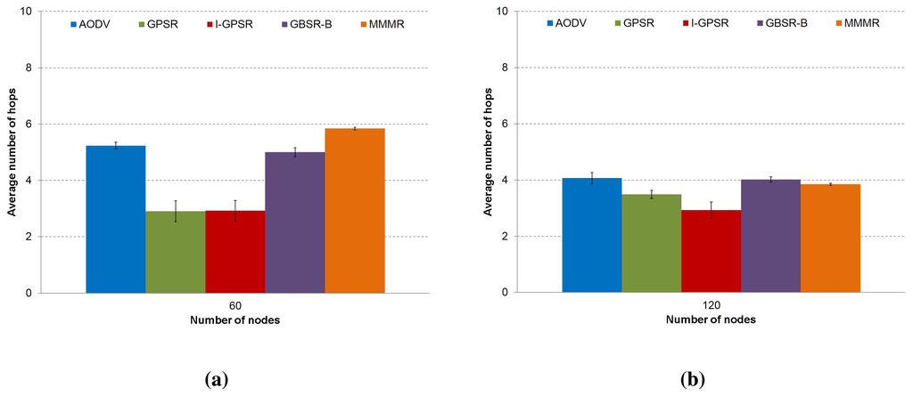 This is because with GPSR, a low number of packets considered to compute the average delay, arrived at the destination. Moreover, much of the lost packets traveled through several hops before being dropped. GBSR-B obtains the highest delay in the low density scenario (see Figure 5a), due to the high amount of time that packets spend in the local buffer. This does not happen so frequently in the medium density scenario, due to the presence of a higher number of neighbors, which allows for a faster selection of an optimal next forwarding hop. The same happens with MMMR, but with better results, since it also includes the building-aware capability and the improvement of the forwarding decision with the use of the four metrics described in the previous section. In the case of AODV in the low density scenario (see Figure 5a), packets that needed a recovery process (after route breakage, new RREQ/RREP (Route Request/Route Reply) messages to find a new end-to-end path are exchanged) suffered a high loss probability and often did not arrive at the destination. Consequently, AODV obtains a low packet delay computed only from packets successfully delivered. In contrast, in the medium density scenario (see Figure 5b), packets that used the recovery process had a higher probability to arrive at the destination, due to the presence of a high number of neighbors, which offers more options to forward the packets. However, those packets suffered a higher packet delay (Figure 5b). Finally, we can see that I-GPSR obtains a slightly lower delay in the low density scenario compared to MMMR, due to the high number of packet losses that used a long path, so that they were not considered in the computation of the average delay. In the medium density scenario, I-GPSR obtains the highest delay compared to the other protocols, due to the process of the next forwarding selection, which penalizes vehicles stopped momentarily in crossroads, although they could be good forwarding candidates.