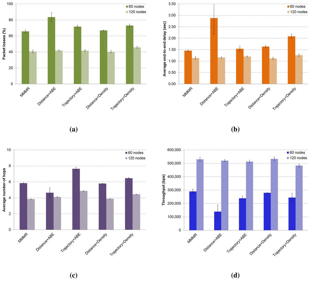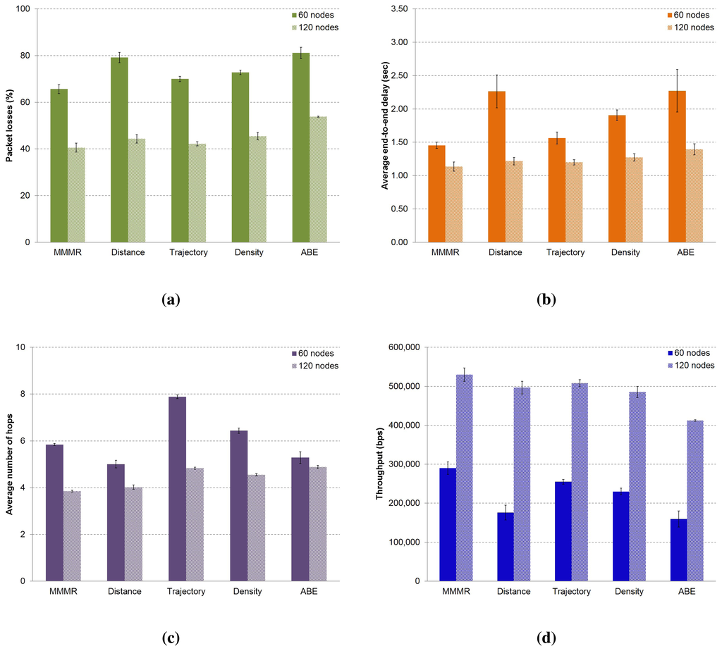 We can see that MMMR (first column) obtains the best results in terms of packet losses (see Figure 8a), followed by the option of taking the forwarding decision based only on the metric “trajectory”, that is, (w1, w2, w3, w4) = (0, 1, 0, 0). Packet losses (Figure 8a), end-to-end delay (Figure 8b) and the average number of hops (Figure 8c) are best when the density of the scenario is 120 nodes, because the probability of finding a good neighbor is higher than in the case of low density scenarios (60 nodes). Moreover, in the low density scenario, the probability of using the buffer to store packets is higher, so that higher delays are obtained. Given that throughput is related to packet losses, we can see that in the medium density scenario, there is a higher throughput (Figure 8d), because lower losses were produced (Figure 8a).