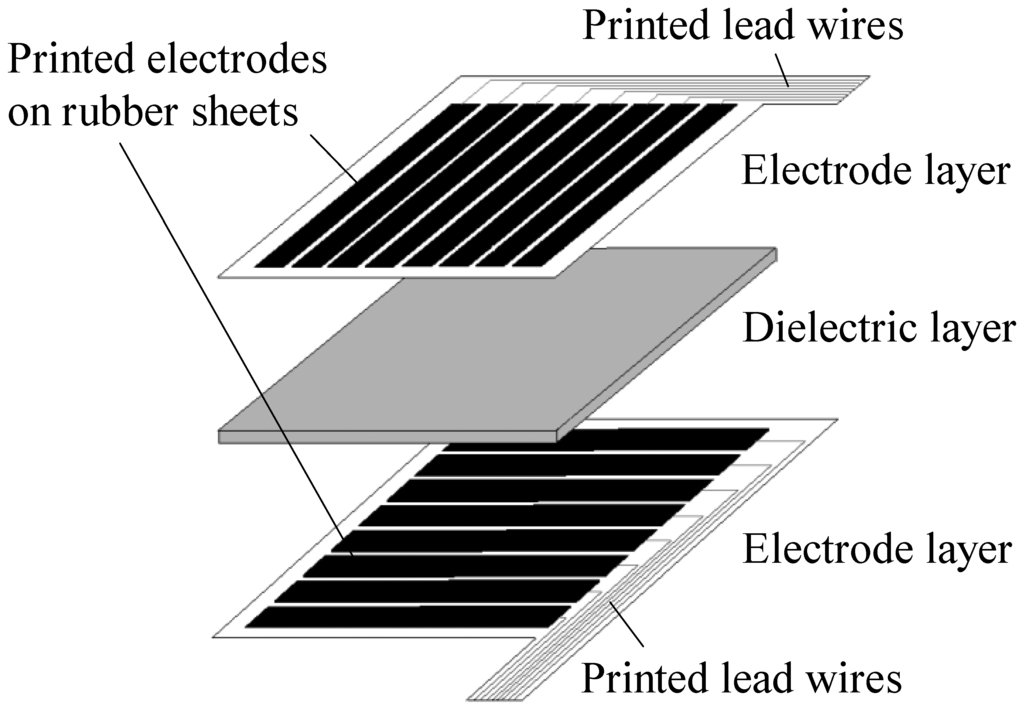 To solve the problems of the above-mentioned sensors, our research group has developed capacitive soft sensor sheets made entirely of polymers such as rubber and urethane foam without the use of metal parts, and applied them to the newly developed care assistance robot RIBA-II [], a successor of RIBA. Figure 1 shows the schematic of such a capacitive tactile sensor sheet. It has a three-layered structure, with a dielectric layer sandwiched by two electrode layers. Each electrode layer has a number of parallel ribbon-like electrodes. The electrodes on the two electrode layers are oriented orthogonally and each crossing area of two perpendicular electrodes makes up a capacitive sensor cell on the sheet. The sheet is an assembly of discretely and independently distributed sensor cells. To avoid confusion, in this paper we call the structure shown in Figure 1 a traditional sensor sheet. Such a structure has been proposed previously and sensor sheets that employ metal electrodes are commercially available []. In the applications to care-related machines, including care assistance robots, however, metal electrodes still have problems such as their low stretchability and high cost. We have devised a method of forming electrode layers by screen-printing conductive rubber onto a flexible rubber sheet to realize compatibility with humans at a low manufacturing cost. This method can also be applied to sensors with a complicated shape and is suitable for the fabrication of sensors on large-area substrates at a low cost.