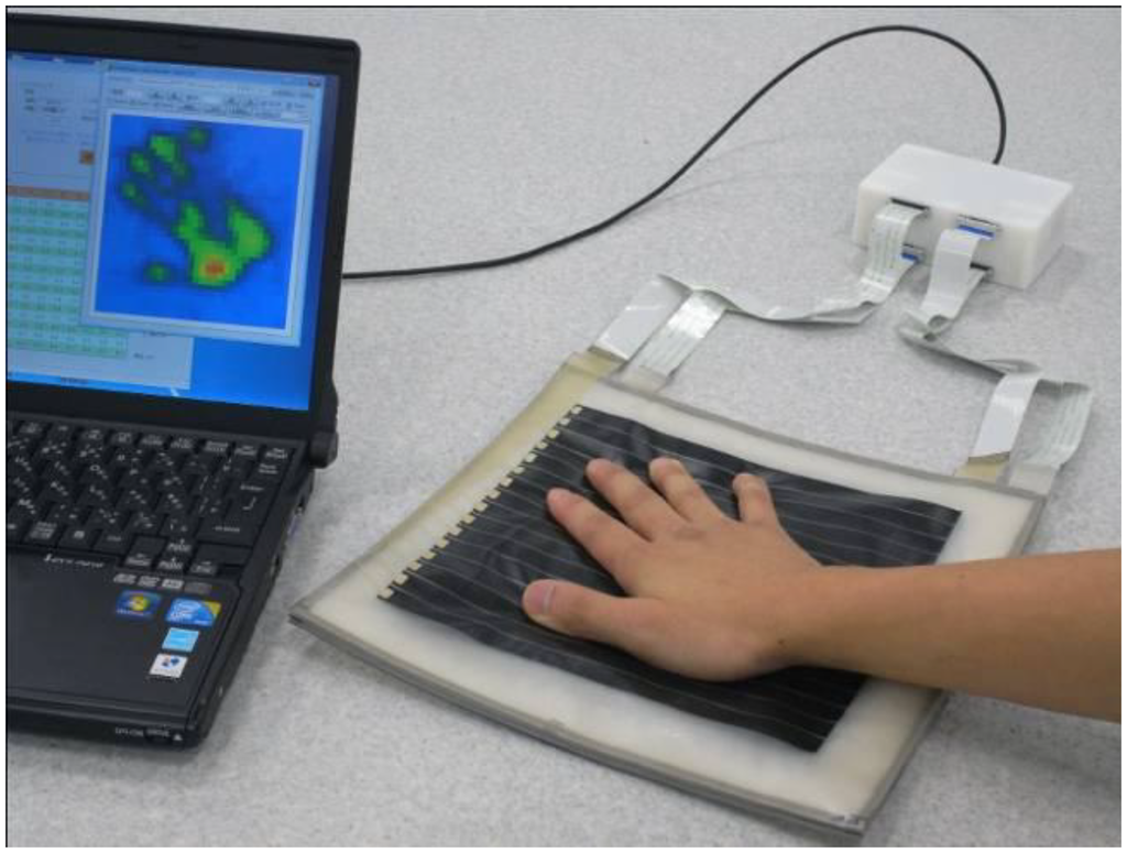 With the practical use of nursing care assistance robots and living assistance robots as well as various human-interactive care and medical machines in recent years, the demands on large-area flexible tactile sensors as interfaces with humans are increasing. To meet the demands, various tactile sensors have been proposed, studied, and developed. Such sensors include tactile sensors that employ discrete semiconductors [], contact resistance [,], conductive rubber [–], piezoelectric polymers [], and electric capacitance [,]. Our research group has carried out research and development on tactile sensors by integrating semiconductor sensors and mounting them on the soft exterior of the care assistance Robot for Interactive Body Assistance (RIBA) [–]. This enabled the operation of the robot based on the human sense of touch and the detection of contact pressure with the person lifted by the robot. However, it is practically difficult to cover the entire body of the robot with such tactile sensors because semiconductor sensors are expensive. Sensor sheets that employ contact resistance and piezoelectric polymers have bending flexibility, but low compatibility with humans; it is necessary for humans to feel that the sensor sheets are pleasant to touch, a property exhibited by cloth and rubber. Also, fashioning such sensor sheets into complicated shapes is difficult.