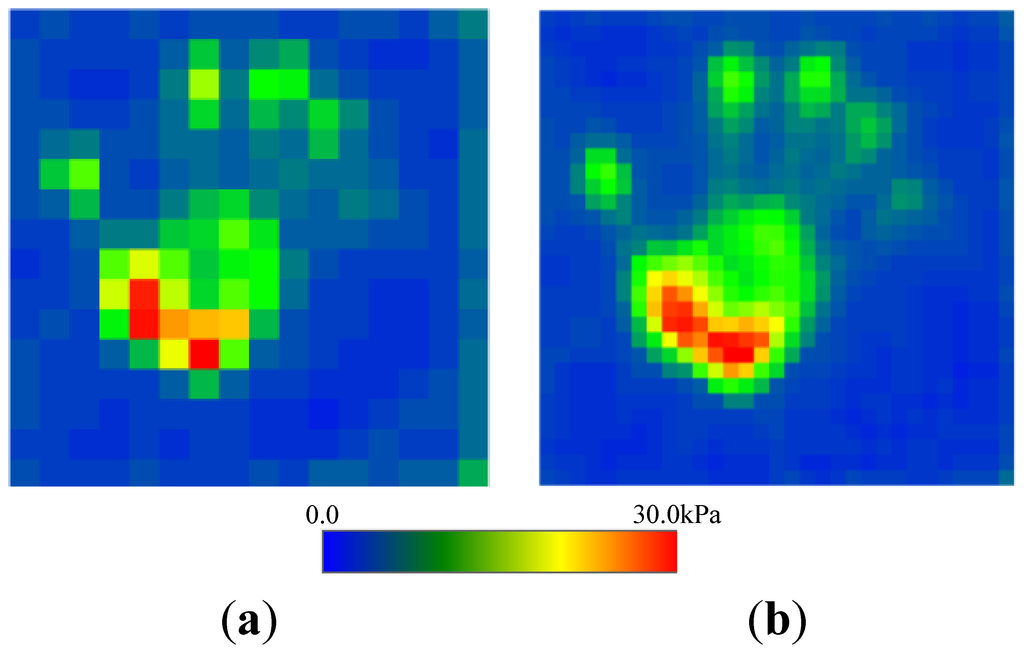 Secondly, we confirmed the improvement on resolution by comparing the proposed two-ply sensor structure with sensor C. The distribution of pressure of the palm of a hand was measured (see Figures 11 and 12). Traditional sensor C, which has a low noise level, had a low resolution of 12.6 mm and was unable to image the shape of the palm clearly. In contrast, the proposed two-ply structure calculates the pressure with its fragmented 6.3-mm-square cells, obtaining a clearer image.