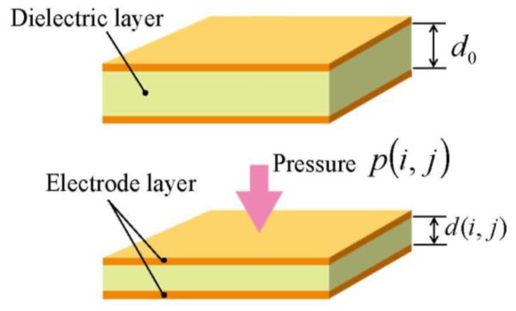 Here, ε0 is the permittivity in vacuum, εr is the relative permittivity of the dielectric layer, and d(i, j) and s(i, j) are the interelectrode distance (i.e., the thickness of the dielectric layer) and the area of the cell (i,j), respectively. Thickness d(i,j) depends only on the pressure applied on the cell (i,j) (see Figure 2). Let Δd(i,j) represent the displacement of the cell (i,j) in normal direction, i.e., the change of the thickness of the cell (i,j), we can express it as: