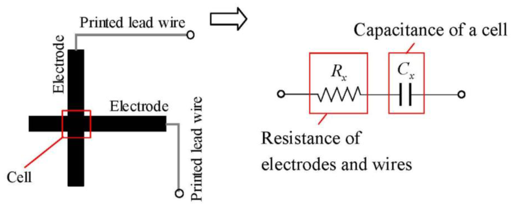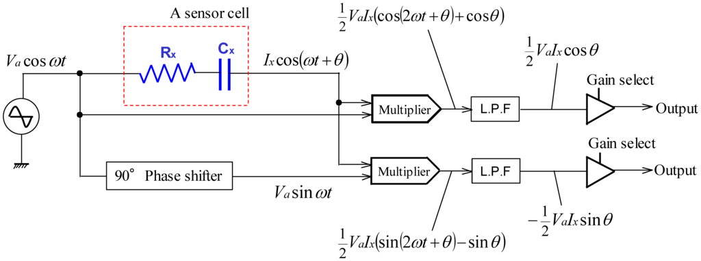 Figure 3 shows the equivalent circuit of a sensor cell. The quantities to be measured are denoted with a subscript x for convenience. In Figure 3, Cx is the capacitance of a cell and Rx is the resistance of the electrodes and wires of the cell. The electrodes also serve as the wires to a cell. Although there are various methods for detecting capacitance, we adopted the impedance vector method since this approach has a high responsiveness and can separate electric resistance Rx and capacitance Cx. Figure 4 shows the flow of the approach. It applies a harmonic voltage: