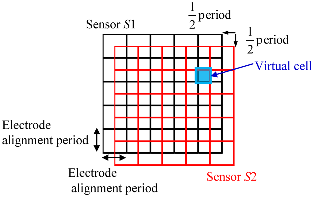 A sensor with a multilayered structure is proposed to solve the problems mentioned in Section 2.2. Figure 5 shows a conceptual diagram of the structure. It stacks two identical sensor sheets S1 and S2 with a shift in position. The shift is half the electrode alignment period, as shown in Figure 5. Here, the electrode alignment period refers to the center to center distance between two adjacent electrodes assuming that electrodes with the same width are placed at regular intervals, and this period is denoted as h. By stacking S1 and S2, virtual cells with a period (virtual electrode width) of h/2 are formed in the region where S1 and S2 are overlapped. The capacitance of each virtual cell can be calculated from the capacitances of the related cells of the two stacked sensor sheets. Because the basic structure of the proposed sensor sheet is the same as that of a traditional sensor sheet, the resolution can be increased by a factor of four without decreasing the measurement precision and flexibility. In addition, stacking three or more traditional sensor sheets is possible in principle, the resolution can be increased by a factor of L2 by stacking L identical sensor sheets with shifts in position of h/L.