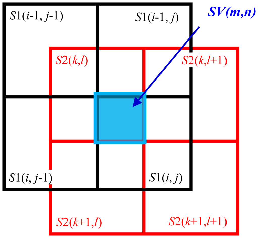 The virtual cells formed by stacking S1 and S2 are denoted as SV (see Figure 6). The cell in the ith row and jth column of S1 is denoted as S1(i,j), the cell in the kth row and lth column of S2 is denoted as S2(k,l), and the virtual cell formed in the region where S1(i,j) and S2(k,l) overlap is denoted as SV(m,n). The capacitances of these cells are denoted as CS1(i,j), CS2(i,j), and CSV(m,n), respectively.