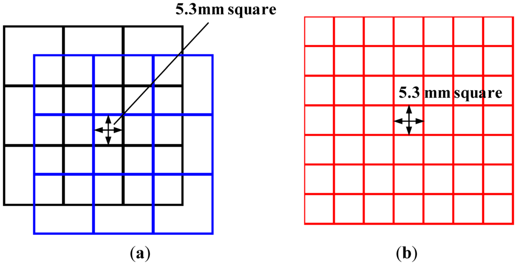 Considering practical use, it is desirable to measure a pressure at both a high precision and a high resolution, but it is difficult for the structure shown in Figure 1 to meet both objectives simultaneously. The resolution of the sensor sheet is the area of a cell and decreasing the width of the electrodes and the gap between two adjacent electrodes to obtain a high resolution is inevitable. On the other hand, soft and high elastic polymer materials such as urethane foam or rubber are used as a dielectric layer to have a high flexibility. These materials usually have low electric permittivity, so decreasing the width of the electrodes implies decreasing the area of a cell and this in turn results in a low capacitance under a certain pressure. As a small capacitance is more easily affected by the electric noises from the lead wires and the circuit boards, decreasing electrode width makes it difficult to measure a small pressure at a high Signal/Noise (S/N) ratio and consequently leads to more complicated and large-scale electronic circuits and higher manufacturing costs, i.e., compatibility between precision and resolution is difficult. To overcome this problem, a new multilayered structure is proposed. This new structure stacks two or more sensor sheets with shifts in position. Both a high precision and a high resolution can be obtained by combining the signals of the stacked sensor sheets. This paper describes the proposed two-ply structure and the related calculation procedure, and furthermore, reports the results of trial production and experiments.