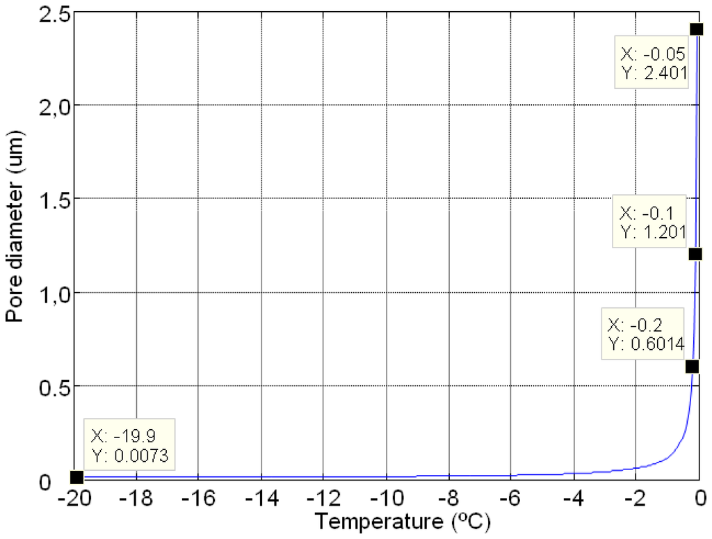 The above Equations (1)–(5) are used to obtain the pore size distribution from the ice volume formed in porous structure during F-T cycles, but it is necessary to know the limitations of this method before comparing it with other measures of porosity.