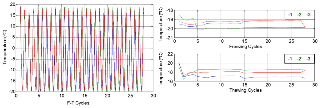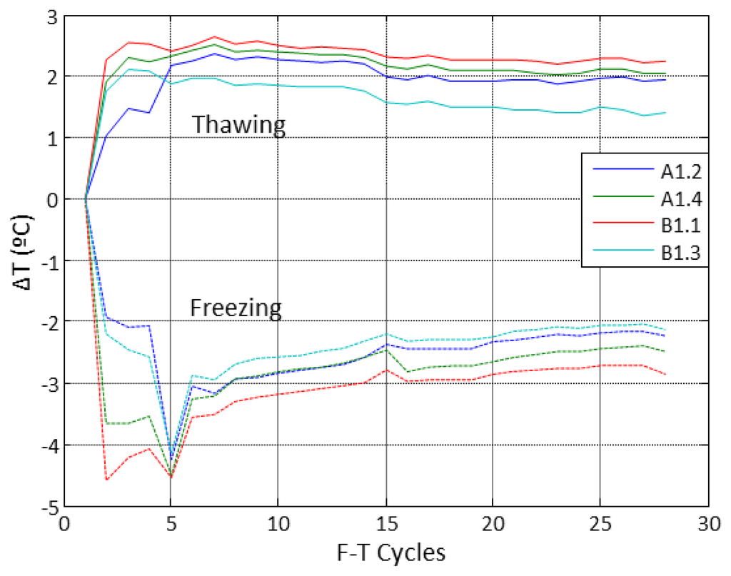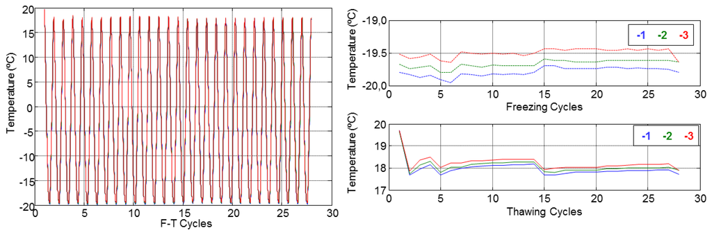 Figure 12 shows the differences of temperature between the sensors embedded in the concrete specimens and the temperature inside the climatic chamber. These differences were calculated at the plateau of the F-T cycles. The highest differences appeared during the first five F-T cycles, probably due to the thermal inertia of the concrete. After the first five cycles the temperature behaviour is almost constant and in general significant differences are not observed among them. We can conclude that the temperature inside the concrete specimens follows the F-T cycle settings in the climatic chamber.