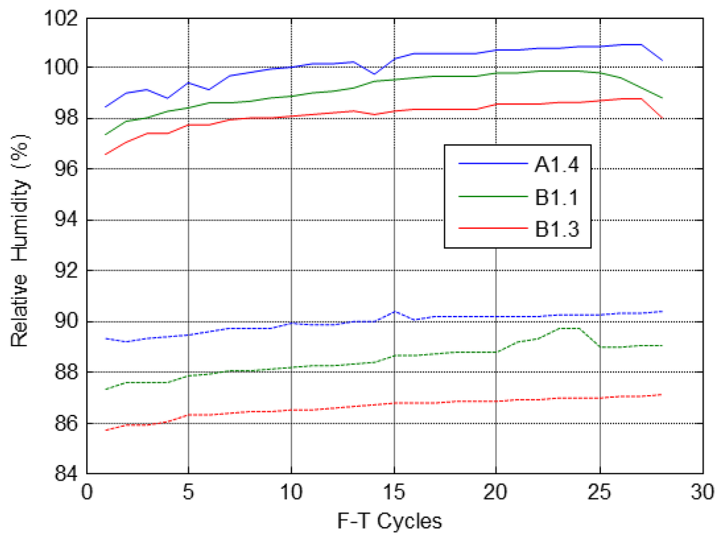 Figure 13 shows the behaviour of the relative humidity during the cycles and with respect to depth inside specimens during the F-T cycles. It can be appreciated that in all specimens the humidity increases with the F-T cycles.