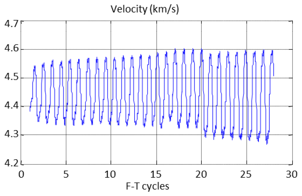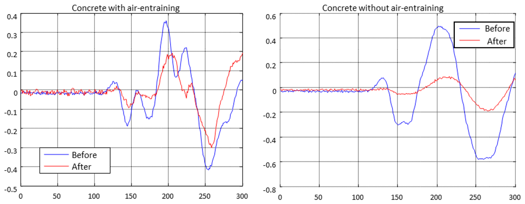 The ultrasonic signal, A-scan, of a specimen of concrete with and without air entrainment, before and after of the F-T cycles is shown in Figure 14. In both cases, it is observed that the ultrasonic pulse changes and the amplitude decrease strongly after the cycles. This behaviour might lead to errors in the ultrasonic velocity values obtained using conventional equipment if a threshold algorithm was used to measure the travelling time [].