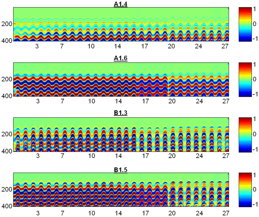 In all specimens it can be observed that in the 20th F-T cycle there is a slight discontinuity in the measurements, shown as a mild colour change, due to an electric power failure in the laboratory. In specimen B1.3 a change can be seen in the ultrasonic signal from the 16th and 17th F-T cycles indicating damage in the concrete material. A similar but smoother behaviour was also observed in specimen B1.5.