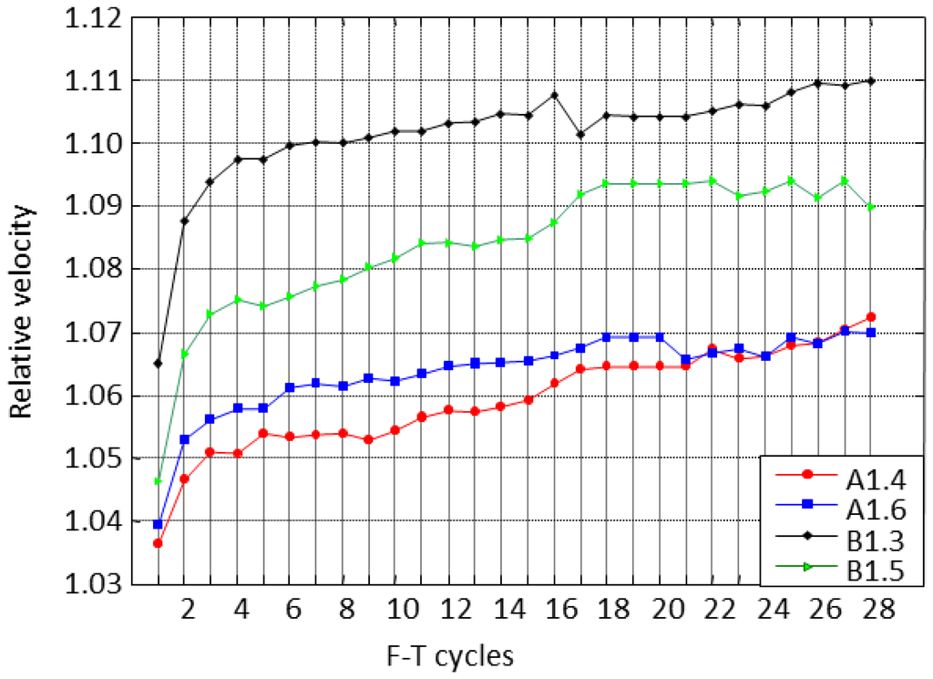 The relative velocity was calculated as the ratio of the maximum and minimum velocity at the plateau of freezing and thawing cycles, respectively. The relative velocity along the F-T cycles illustrates that the specimens are grouped by the type of mixtures, A or B, see Figure 17.