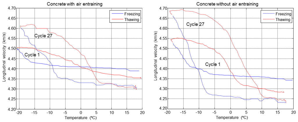The evolution of the ultrasonic velocity with the temperature in the concrete specimens is shown in Figure 18. In this case only F-T cycles 1 and 27 are represented. It can be noticed that the velocity in mixture B is higher than the mixture A due to the air entraining agents which cause an increased attenuation producing a decrease in velocity. It is also observed how the hysteresis increases between the freeze and melting between the first and last F-T cycles, this effect is more pronounced in the concrete without air entrainment indicating that there is more ice volume in these specimens.