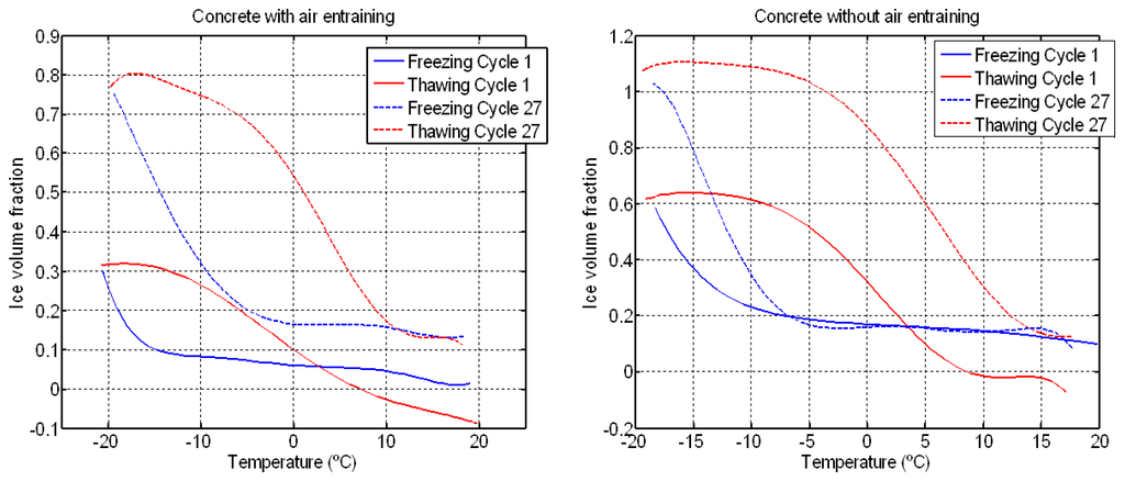 The volume fraction of ice was determined from the micromechanical model and the longitudinal velocity. The variation of ice volume fraction with temperature is shown in Figure 19 at the beginning and end of cycles. In both materials, an increase in the ice volume and the hysteresis between freezing and thawing is observed, impying that the volume of frozen pores increases. The values of ice volume fraction greater than 1 in concrete without air entrainment (cycle 27) are due to the porosity increase as can be seen in Table 3. In concrete with air entrainment, the ice volume fraction is less than 0 in cycle 1 because the ultrasonic velocity during thawing is less than the minimum velocity during freezing. This behaviour may indicate that the concrete sample has been microcracked and, hence, the velocity decreases.