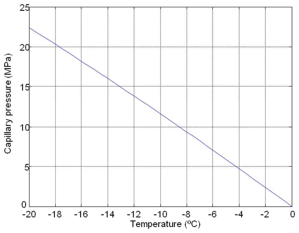 The variations in the produced capillary pressure and the pore diameters during a freezing and thawing cycle are calculated from Equations (1) and (2). In this case an F-T cycle between −20 °C to 0 °C with a step of 0.05° of temperature was used to establish the limitation of thermoporometrical model. Figures 1 and 2 show the behaviour of pore diameter and capillary pressure versus temperature, respectively. In Figure 1, the numerical behaviour of the pore diameter with the F-T cycles showed a vertical asymptote at 0 °C that implies limitations on the measurement.