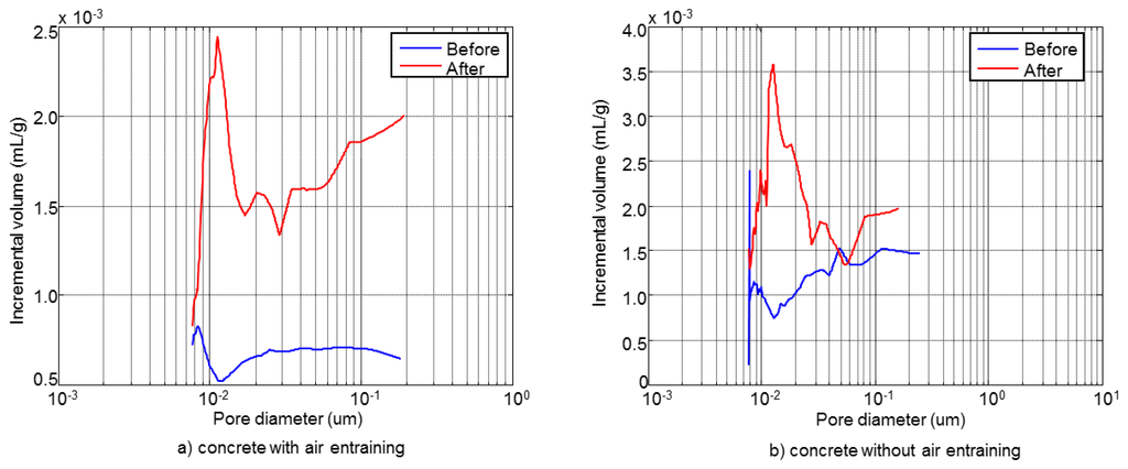 Figure 8 shows the pore size distribution of concrete with and without air entrainment, A1.4 and B1.3, respectively. The specimen A1.4 shows a maximum in the pore distribution centred in 0.05 μm, before the cycles. However, the pores volume is increased as consequence of freeze and thaw of water after the cycles (see Table 3). Also, a new peak appears at 40 μm after the F-T cycles. In the specimen B1.3 after the F-T cycles a new peak at 0.2 μm appears in the zone of capillary pores, with a volume similar to the peak at 0.05 μm, which is present before and after the cycles. This behaviour indicates the formation of microcracks in concrete without air entrainment.