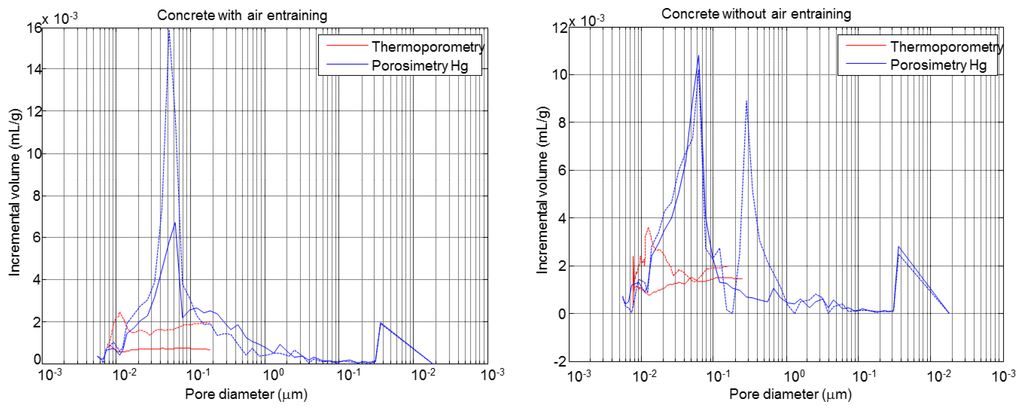 The pore size distribution of concrete specimens determined by the thermoporometry technique is shown in Figure 20. In both materials, the F-T cycles led to an increase in the volume and diameter of pores and to a peak at 0.01 μm. This behaviour is more accentuated in concrete without air entrainment. Figure 21 shows the comparison between the pore size distribution determined by mercury porosimetry and thermoporometry techniques before and after the F-T cycles. In both cases an increase of the pore volume is observed, but in different proportions. This is a consequence of the differences between these methodologies (mercury/water, high pressure/capillarity and thermal expansion) and the test conditions. In the first case, the samples are dried under vacuum while with the thermoporometry the samples are saturated.