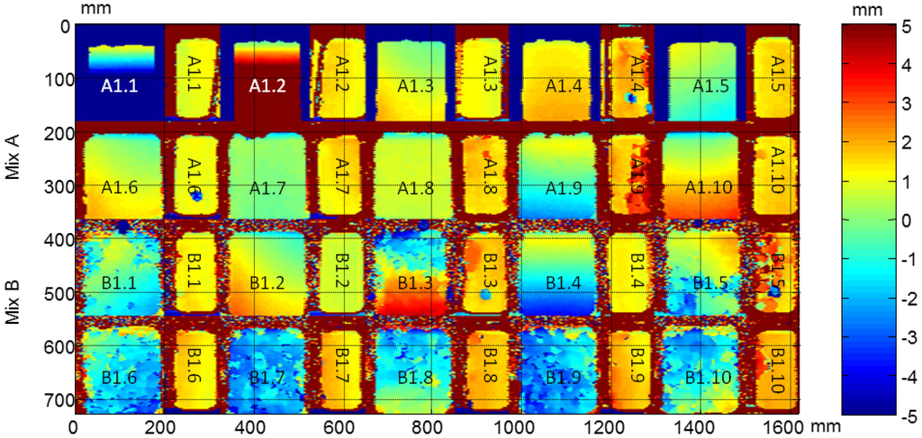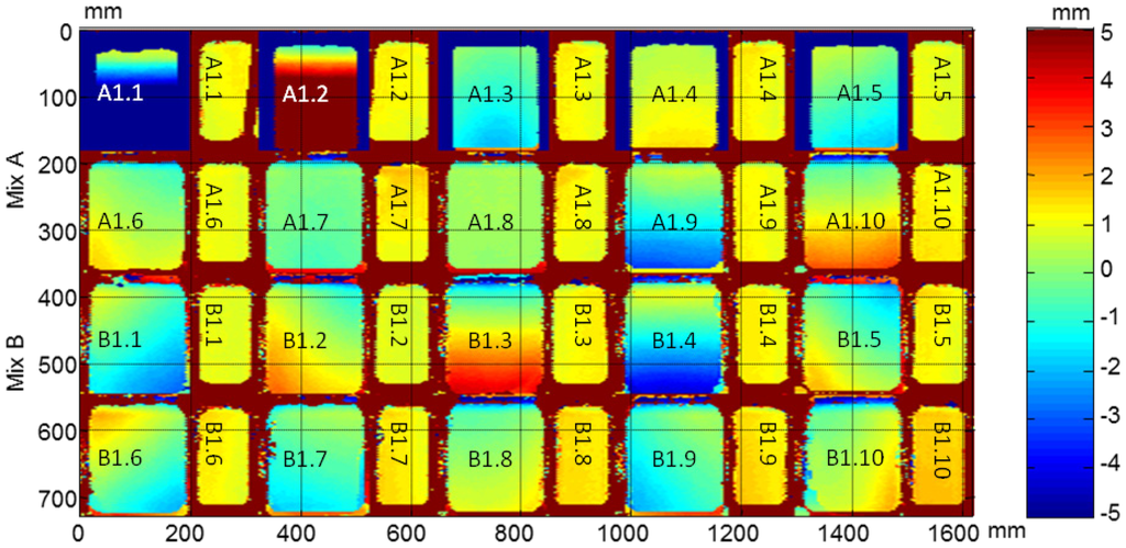 It should be noticed that in all images the second and fourth specimens in the third row, B1.2 and B1.4, are not subjected to the accelerated cycles. The dimension maps before and after the F-T cycles of all specimens and the arrangement of specimens in automated inspections are shown in Figures 22 and 23, respectively. These images indicate the difference of dimensions regarding nominal, width = 70 mm and length = 150 mm in both Figures. The differences with the nominal dimensions before the cycles reaches up to 5 mm. It is probably due to movement of the polytetrafluoroethylene thin plate in the filling process of the cubic mold.