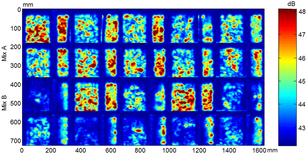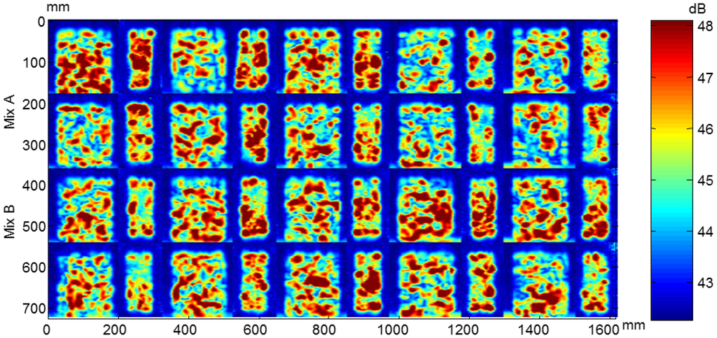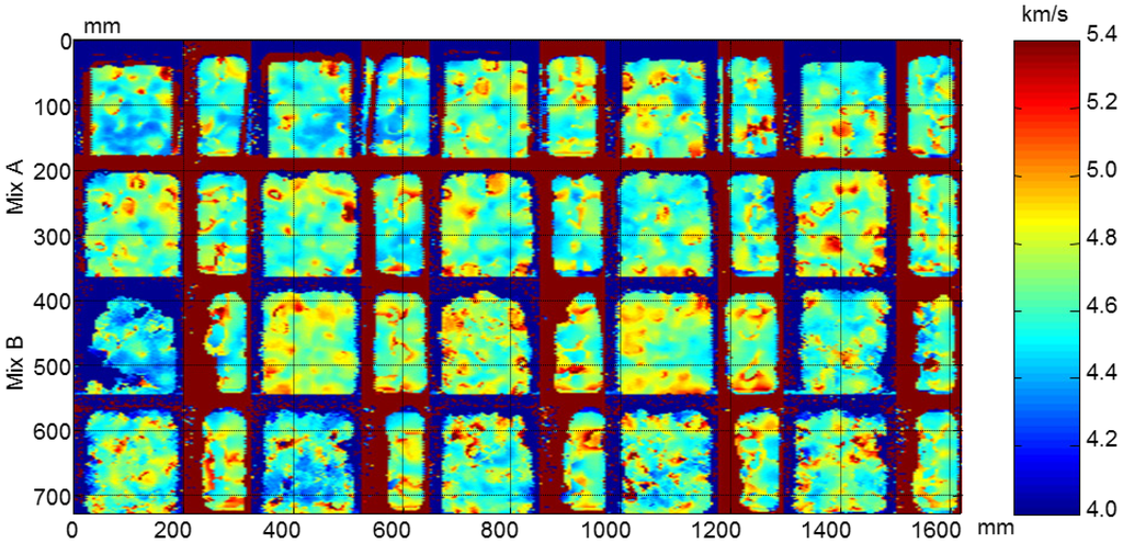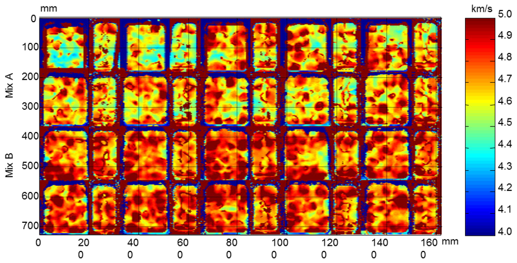 The velocity maps of the concrete specimens before and after the F-T cycles are shown in Figures 24 and 25, respectively. In the images before the cycles, the non-uniformity of the ultrasonic velocity within the same type of concrete specimens can be observed. The concrete specimens with air entraining agents have also less velocity that the specimens without air entrainment due to the air bubbles causing a decrease in ultrasonic velocity [].