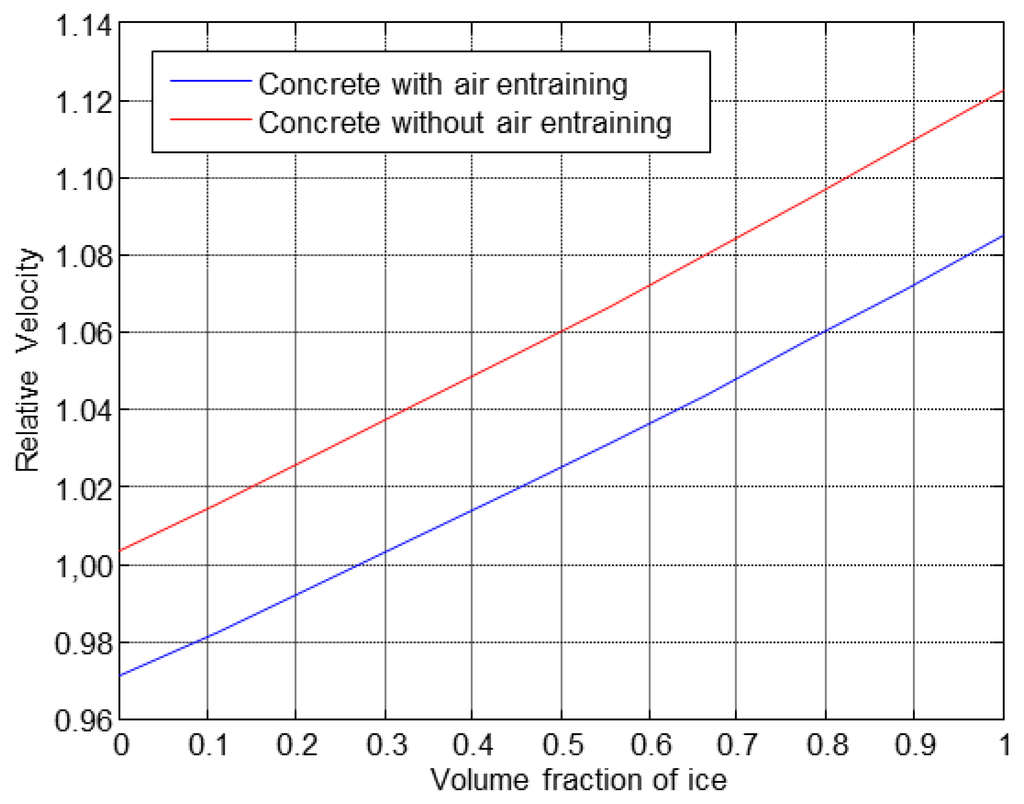 The results obtained from the theoretical study about the behaviour of the ultrasonic velocity with the increase of the ice fraction volume are shown in Figure 3. An ice volume fraction equal to 0 corresponds to the saturated water specimen at the beginning of the first cycle, while a volume fraction equal to 1 corresponds to the specimen with all pores frozen.