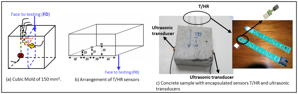 The experimental trials were done using two types of concrete specimens with and without air entraining agents that were subjected to accelerated F-T cycles in accordance with the Rilem recommendations []. In this case the monitoring was performed using temperature, humidity and ultrasonic sensors. The temperature and relative humidity (T/RH) sensors were embedded in concrete during the manufacturing processes, while the ultrasonic sensors were adhered to the outer parallel surfaces of the specimens after the curing process. The embedded sensors, ultrasonic transducers and the multisensorial system for monitoring the specimens, were designed by the research group []. One advantage of the designed monitoring system is the large number of measurements obtained along F-T cycles without removing the specimens from the climatic chamber.