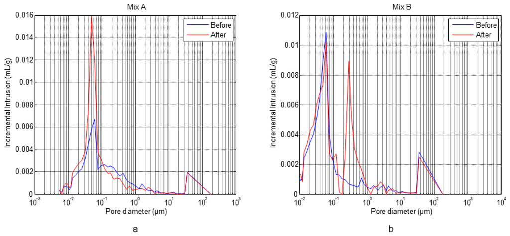 The obtained results from the microstructural mercury intrusion porosimetry and thermogravimetric analysis tests performed before and after the F-T cycles for specimens A1.4 (Mix A) and B1.3 (Mix B) are shown in Figure 8 and Table 3, respectively, [].