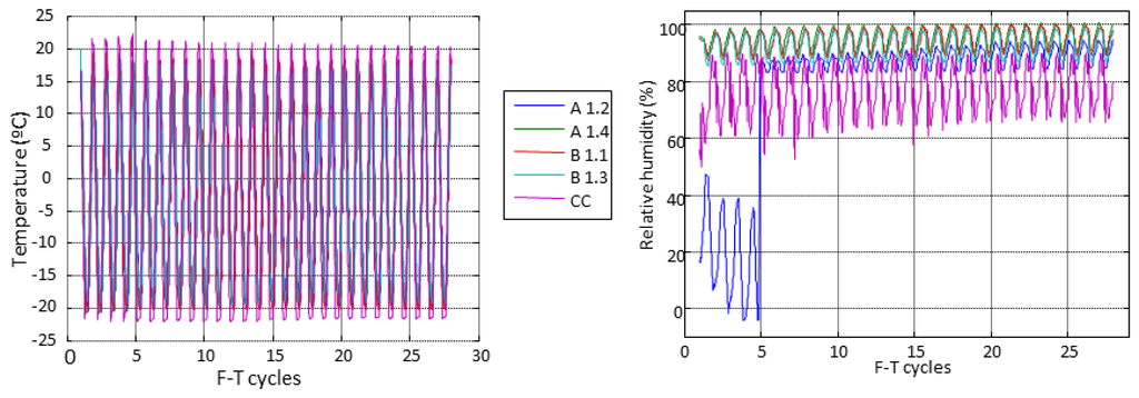 The temperature and relative humidity behaviour inside the concrete specimens and the ambient conditions in the climatic chamber along all F-T cycles is represented in Figure 9. The dissolution of NaCl strongly affects the humidity sensors of the specimen A1.2 as shown in Figure 9 (right). The temperature and relative humidity inside of specimens follow the same behaviour along of the F-T cycles, according to the fixed cycle in Figure 4.