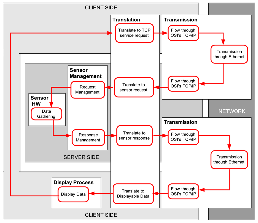 These split times can be measured without much intervention in many networked systems, just by time-stamping at the client interface and at the server side the sensory data being transmitted, which neither involves a significant overload nor requires the use of distributed clock synchronization algorithms. However, this splitting is not always possible. There are a number of reasons for this: (i) the server side might not allow us to time-stamp messages because it is a closed implementation; (ii) if the format of the messages carrying the requested sensor data cannot be modified, they cannot include the time-stamps; and (iii) the clock precision on the server side might not be good enough to distinguish short server delays, which are really common—we cannot allow for zero delays in our approach because of the impossibility of many distributions to explain their occurrence: lognormal, weibull, erlang and gamma are limited to model strictly positive delays in most or all of their parameter configurations.