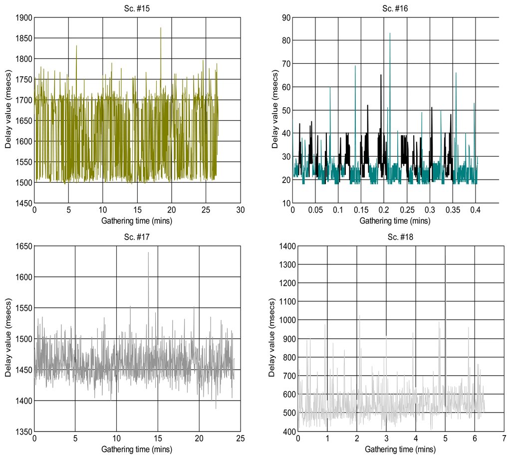 Finally, we have consider a special class C for scenarios that have neither abrupt changes of regime or bursts nor relevant fluctuation of their trends—thus, in principle they could be in class B—but that present outliers that are much smaller than the majority of its sequence of delays, something that does not occur in other classes and that we believe can have consequences in its modeling with many of the distributions explained in Section 3.1—due to the fact that their histograms do not follow the typical shape of a long-tailed distribution on its left-side portion. Scenarios #8, #11, #13 and #14 can be assigned to this class.