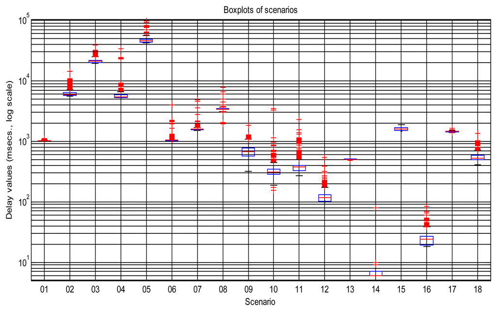 Figure 2 shows the sequences of total delays that we have measured in the sensory loop for each of the scenarios defined in Table 1, versus the time when each delay value was measured; it is easy to observe abrupt changes of regimes, outliers and bursts in those delay signals. Also, some of them exhibit smooth changes in their average, i.e., their trends vary. In that figure we have drawn thick lines for separating portions of the scenarios where we cannot detect visually relevant abrupt changes or other non-linearities (i.e., these portions are near-stationary, also called “regimes”), and marked some clear bursts. The boxplots of Figure 3 confirm the wide range of time delays measured and the pronounced skewness of their marginal distributions.