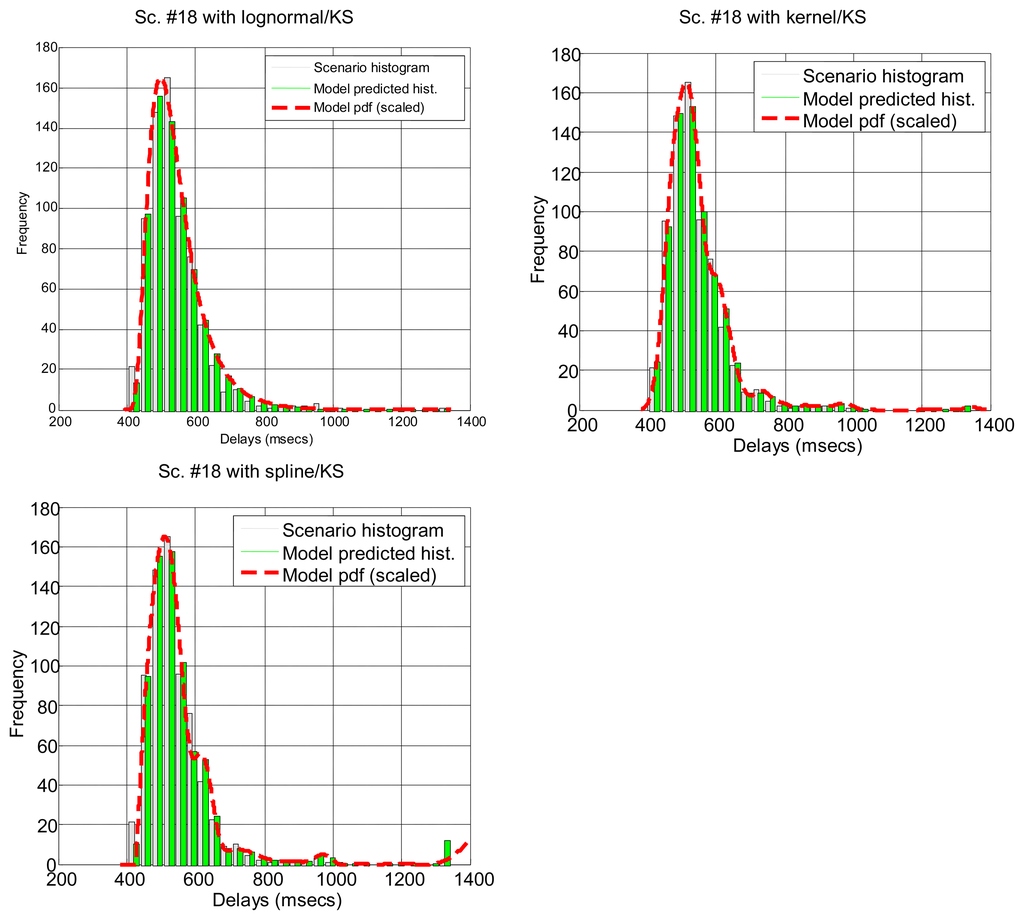 After running the significance tests, we see in Table 4 that, as expected from the multimodal nature of most scenarios, only a few of them can be explained by parametrical models: #3, #2 and #18 (corresponding to the B class and to a percentage of all delay values in all the scenarios below 12%). The rest of the scenarios do not support the null hypothesis. In the case of non-parametrical models, kernel and spline provide the best results, with above 40% of delay values explained. Non-rejected scenarios are displayed in Figure 5 for illustrative purposes. These results show that, for a parametrical choice, the lognormal or erlang distributions could be preferred when we are not able to detect outliers, bursts and regimes, but these are not good enough and might be applicable to very few scenarios. For a non-parametrical option, the kernel distribution should be the best election. In general non-parametrical models are able to explain scenarios from all classes (A, B, C), given their closest fitting to the particular data in the sample (which leads, on the other hand, to the previously mentioned problem of overfitting). The SoG model obtains worse results than the kernel due to its restriction in the number of modes, while the spline is also worse than the kernel due to its greater overfitting, that produces very good models of the data used for fitting but not in its goodness-of-fit with the delays reserved for hypothesis testing.