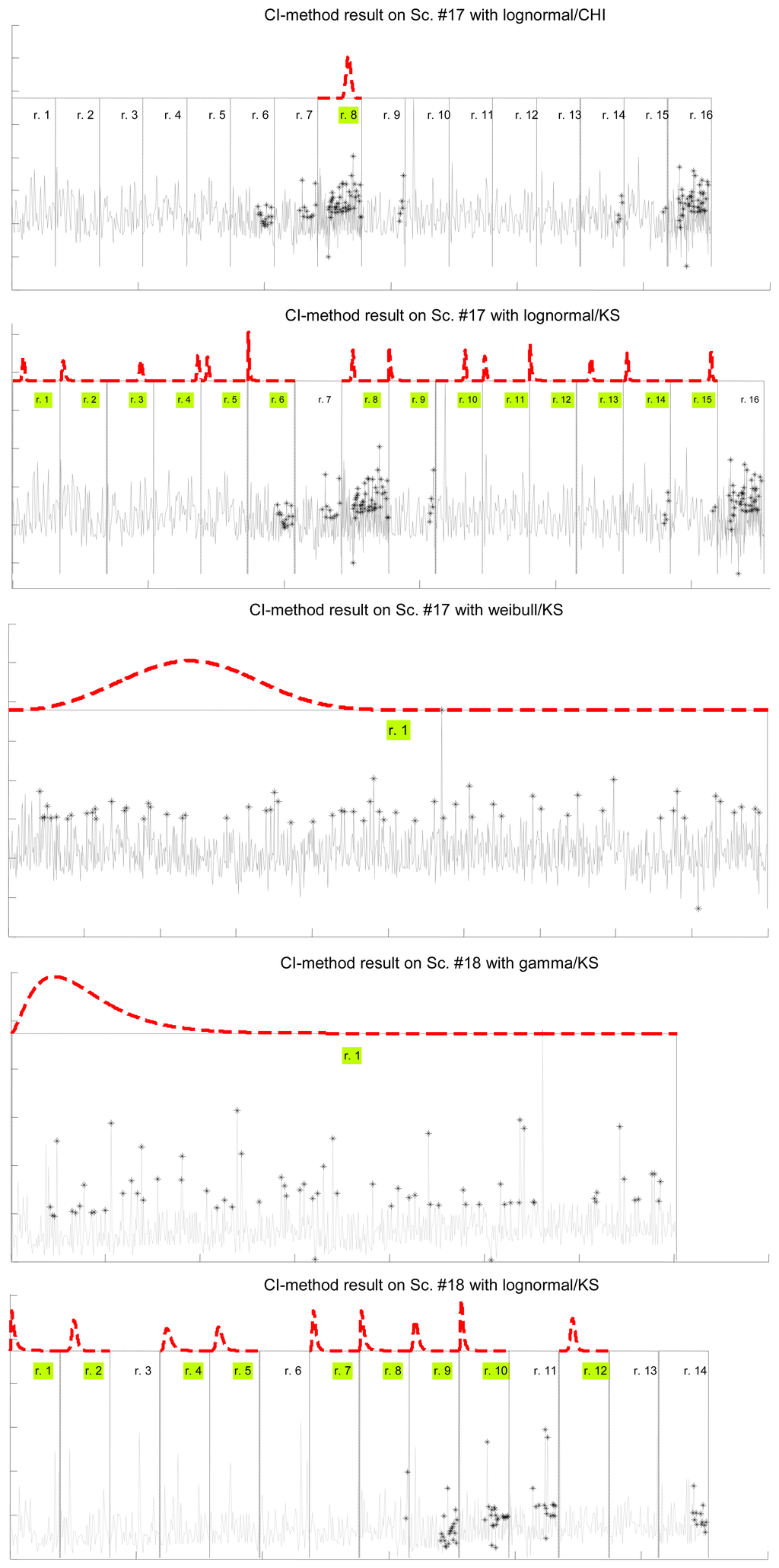Figure 7 illustrates the results for the scenarios that have been modeled successfully. On the top plot of each figure we have drawn the models found for the different segments (regimes) that have been separated by the confidence interval method. Bursts and outliers are marked with black asterisks.