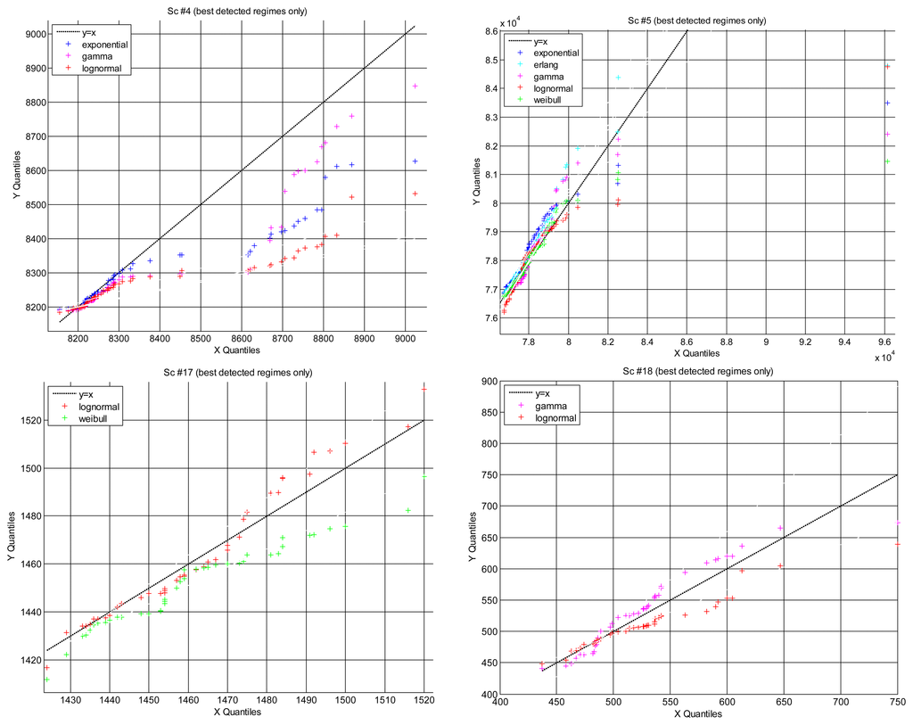 Figure 8 represents the Q-Q plot of all scenarios that we have found where different models have explained well the same segments of data (the only case when we can carry out a fair comparison). In general, all scenarios are better modeled in the lower quantiles, i.e., the right tails of the distributions are not good models of the data, which is natural because there is less delays gathered in those tails. We can also observe that data are better modeled in scenarios #17 and #18 than in scenarios #4 and #5, but note that this is only a qualitative appreciation: all the depicted cases have passed the hypothesis test, therefore they are all statistically good as models of the data.