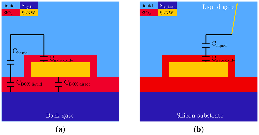 In this study, it was demonstrated that there is a different coupling of the gate potential to the SiNW-based device when this potential is applied via the back gate compared to application via a liquid gate. This difference is explained by the BOX layer through which the potential is coupled in the case of the back-gate configuration. This capacitance plays a dominant role over the other relevant capacitances involved. The capacitance of the solution is much less relevant because of its conductivity. Consequently, a reasonable approximation of the system is obtained, even when this layer is not taken into account in the capacitance of the system. Local addition of an individual back gate, which only acts through the area right below the SiNW and which has no capacitive coupling through the liquid, could make a quantitative description of the BG easier. It would also make it possible to individually gate the devices, providing more possibilities for sensor arrays with individual properties.