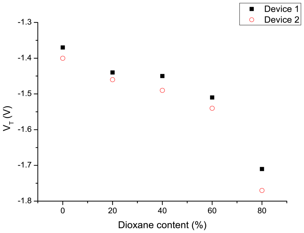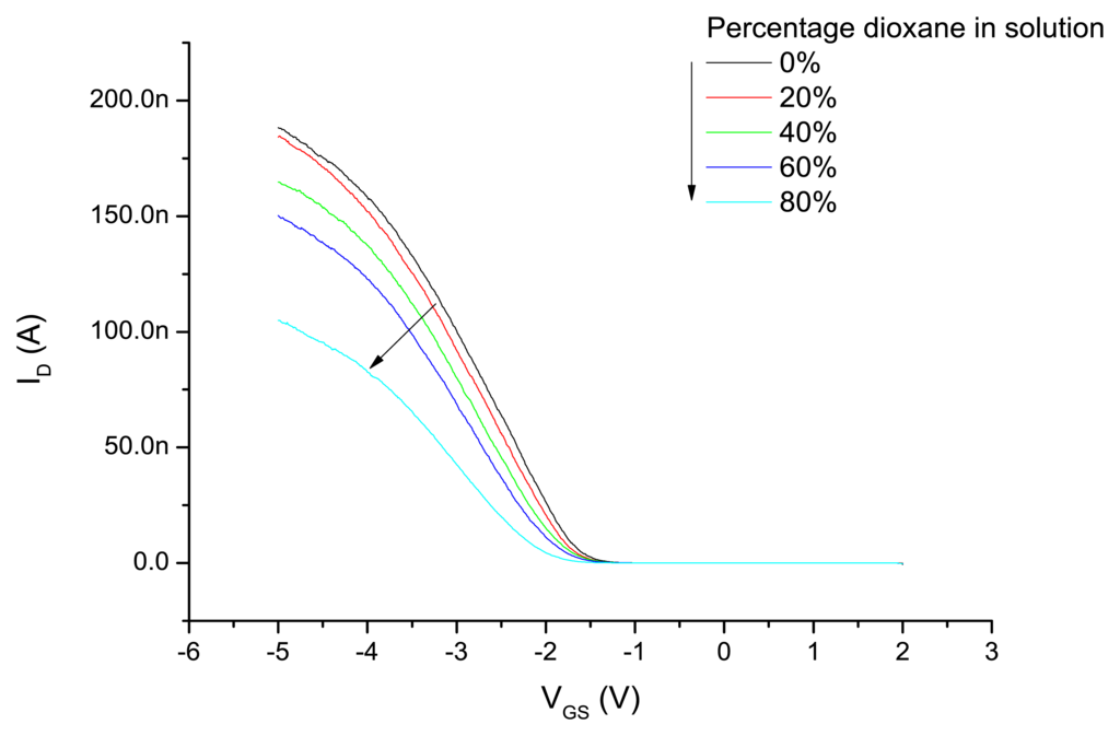 Subsequent to the experiments with the different modes of applying the gate potential, the device was exposed to water–dioxane mixtures and the ID-VGS characteristics are measured as described above by applying a variable potential to the Ag/AgCl electrode and the back gate connected to ground. The results are shown in Figure 4. Increasing dioxane content of the water–dioxane mixture required the application of a more negative gate potential to arrive at the same drain current. From the ID-VGS curves the threshold voltages were determined and plotted as a function of the dioxane content in Figure 5. A more negative VT was observed with increasing dioxane content.
