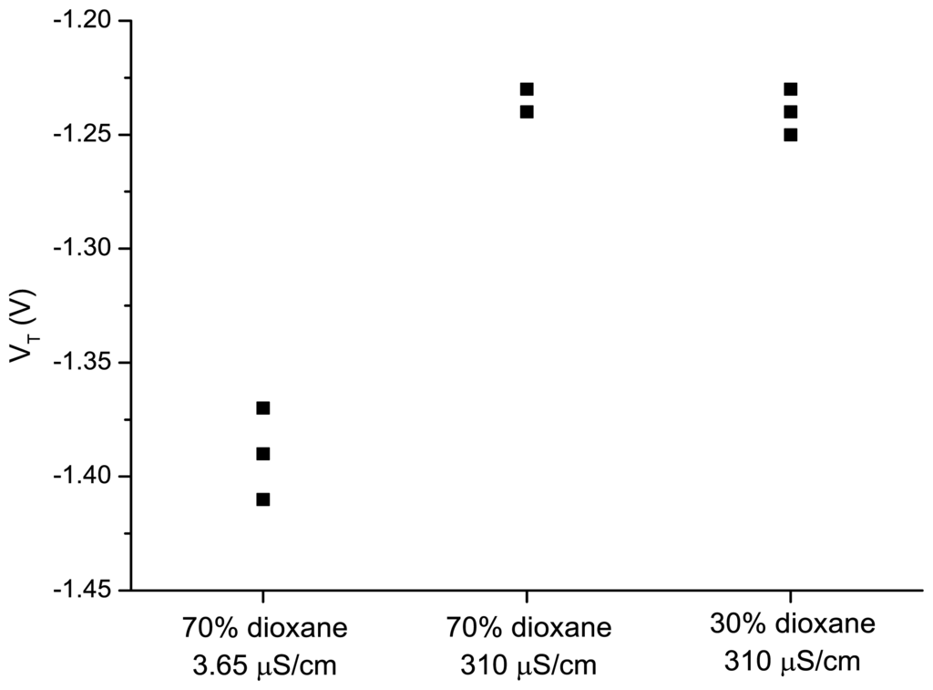 To discriminate between these two possibilities we have investigated the change of the medium capacity, by changing the electrolyte concentration and therefore the electrical conductance. A higher fraction of dioxane decreases the conductance and decreases the capacity. A less negative VT is thus expected for a higher capacity. We have performed the experiments with the following solutions: (a) water/dioxane (30:70 v/v) with a conductivity of 3.65 µS/cm; (b) water/dioxane (30:70 v/v) with tetramethylammonium chloride added to obtain a conductivity of 310 µS/cm; and (c) water/dioxane ratio (70:30 v/v) with tetramethylammonium chloride added to obtain a conductivity of 310 µS/cm. It was observed (Figure 6) that changing the dioxane/water ratio from 30/70 to 70/30 (v/v) at a constant conductivity of 310 µS/cm did not influence the threshold voltage. Reduction of the conductivity to 3.65 µS/cm for a water/dioxane ratio 30/70 (v/v), resulted in a decrease of the threshold voltage. This shows that the conductivity has a larger effect on the gate potential to be applied for maintaining the drain current than changing only the ratio of water to dioxane.