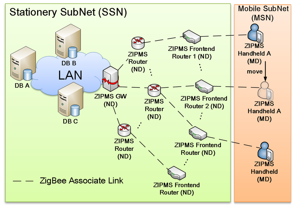 In Figure 1, there are two parts in the ZIPMS, namely the Stationery Subnet (SSN) and the Mobile Subnet (MSN). The reason of preferring ZigBee for SSN to WiFi is that ZigBee possesses a mesh capability and is scalable. ZigBee is a fully mesh network that would not suffer from a single point failure and the devices (stationary) can be relocated easily due to wireless nature.