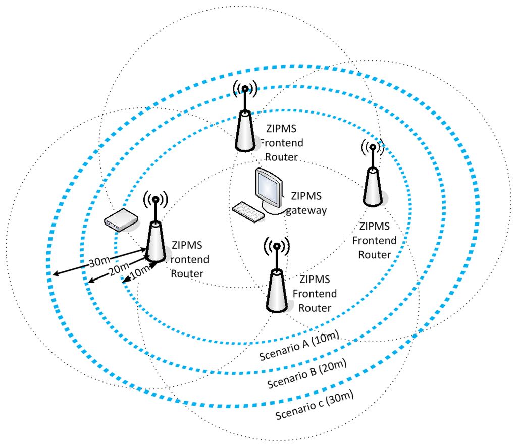 The ZIPMS handhelds acted as biomedical sensors which send the collected medical data to the frontend routers at various date rates, from 10 kbps to 80 kbps 5,000 times. A patient carried a handheld and walked around the frontend routers at a specific distance (d) as shown in Figure 11. Three scenarios A, B, and C with d = 10, d = 20 and d = 30 respectively were investigated. For each scenario, the transmission data rate was increased from 10 kbps to 80 kbps with a step of 10 kbps.