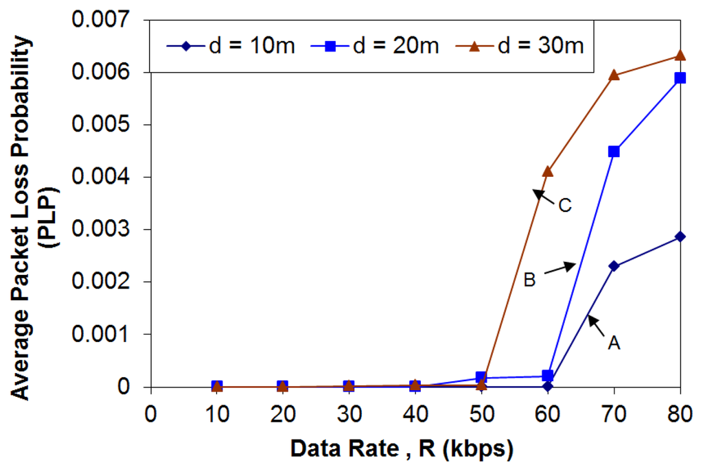 The Packet Loss Probability (PLP) for ZIPMS under different data rate (R) and communication distance (d) conditions were shown in Figure 12. PLP is a measure of the ratio of the packet loss during the experiment for different frontend routers. It is seen that the PLP is below 0.7% for each case, irrespective of the communication distance and data rate. Despite the communication distance, PLP increases as R increases (as observed from curves A, B and C) because higher transmission data ratea may increase the chance of buffer overflow which causes data loss. Moreover, PLP of curve C is the highest, followed by curve B. Needless to say, the PLP of curve B raises the least. This is simply because of the effect of communication distance. Longer communication distance leads to weaker signal strength, therefore PLP increases as the communication distance increases. If the QoS requirement of PLP is set as 10−4, the maximum data rate of ZIPMS should be 40 kbps which is sufficient for all types of medical data as given in Table 1.
