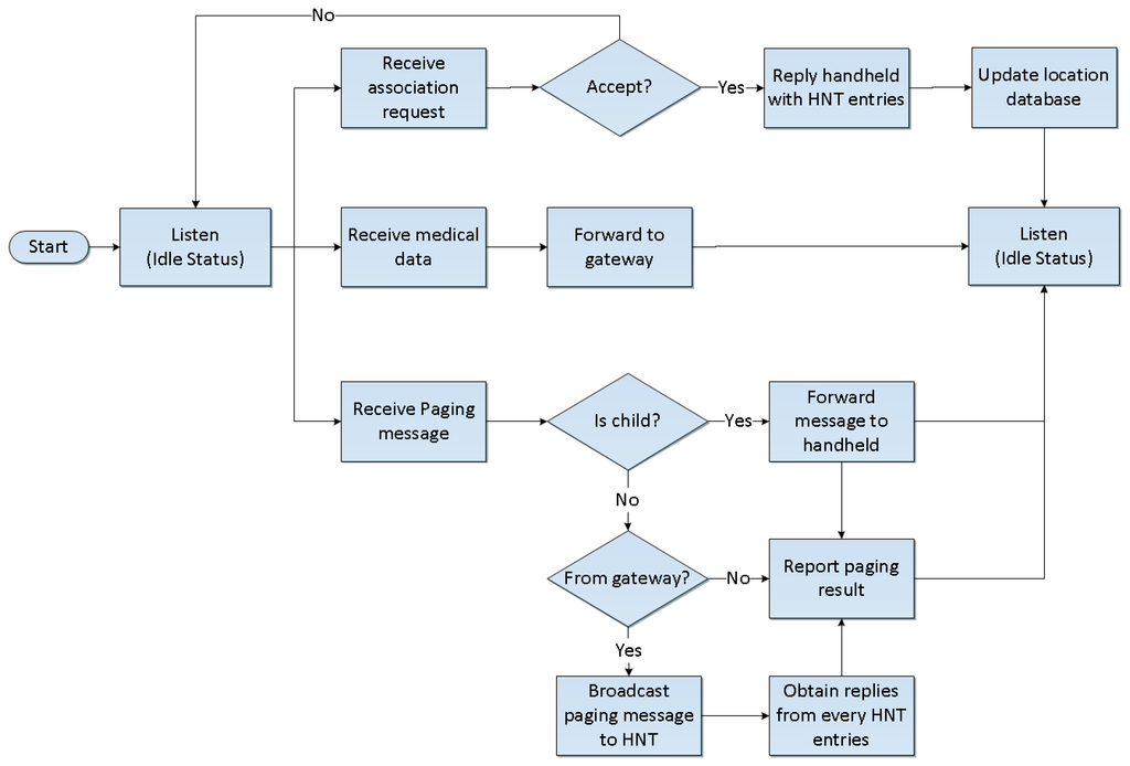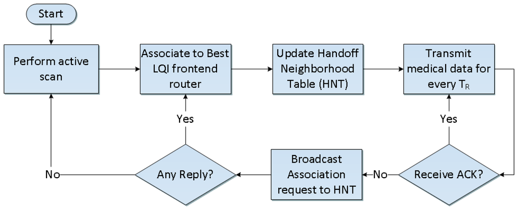 Under normal circumstances, the ZIPMS handheld will perform an active scan to locate ZIPMS when it is powered on. After completing association to the best LQI ZIPMS frontend router, the ZIPMS handheld will update the Handoff Neighborhood Table which stores the short addresses of nearby frontend routers. Referring to Figures 1 and 2, the ZIPMS handheld is associated to the ZIPMS frontend router 1 originally. ZIPMS handheld sends out the medical data every TR seconds. As long as the ZIPMS handheld moves toward ZIPMS frontend router 2, the ZIPMS handheld will not receive the acknowledgment from ZIPMS frontend router 1 anymore. Therefore, the ZIPMS handheld invokes a fast handoff procedure. With HNT, the ZIPMS handheld can directly broadcast association requests to the frontend routers (listed in HNT) such as ZIPMS frontend router 2 without performing scanning. After receiving the replies from the HNT frontend routers, the handheld will then attach to the device with the best LQI. Comparing to the standard orphan scan procedure, less time is used and so the data loss probability will also be reduced. If no reply is received from HNT frontend routers, the ZIPMS handheld will perform an active scan again. The active scan is initialized here instead of an orphan scan because an orphan scan only realigns the orphan device with its original parent (referred as ZIPMS frontend router 1 in this example). Since a ZIPMS handheld is a mobile device which needs to be attached to a new parent, active scan is applied. ZiM2 and WiFi use similar handoff approach, they first disassociate from original parent/access point. Then, they scan the environment and hunt for a new parent/access point to associate. Attention is drawn to the fact that ZiM2 has incorporated HNT to reduce the frequency of performance scanning which reduces the energy consumption and accelerate the handoff process.