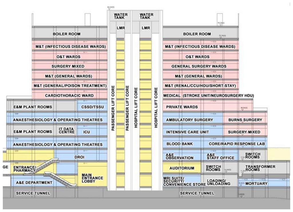 Prior to going into the detailed steps, a brief introduction of the studied site is given. The Prince of Wales Hospital was built in the 1970s. To alleviate the pressure of increasing population, the Main Clinical Block and Trauma Center was built in 2006 and started to serve citizens in 2010. The details of the Center and typical ward settings are tabulated in Tables 2 and 3, respectively, while the schematic of the center is shown in Figure 4.