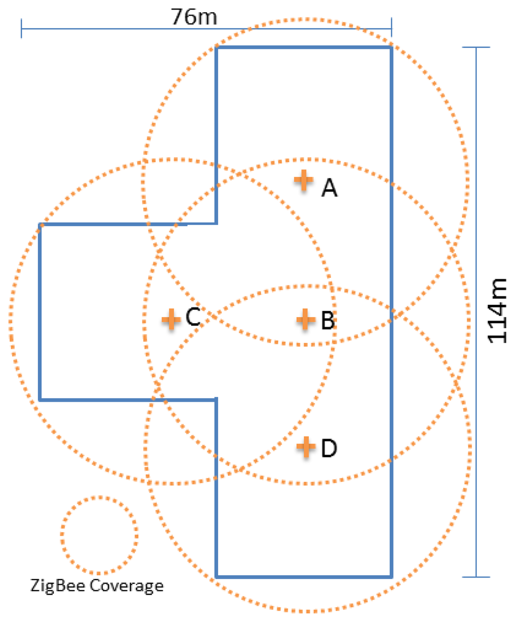 With better understanding of testing site, the attention is drawn to the network planning for ZIPMS. After performing an onsite connectivity test, it was found that the communication radius was 35 m and the ZigBee signals could penetrate two floors. For example, the ZigBee device on the 3rd floor could directly communicate with ZigBee device on 1st floor using one single hop.