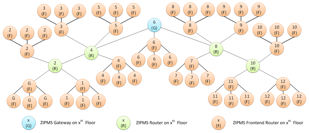 The next issue is to figure out the minimum number of ZIPMS routers that connect the ZIPMS frontend routers to the ZIPMS gateway. The transmission delay is reduced by minimizing Lm, thus the ZIPMS gateway is located on 6th floor. As mentioned in earlier text, ZigBee signal can penetrate two floors, so ZIPMS routers are inserted on 2nd, 4th, 8th and 10th floors in order to propagate the ZigBee signals. Finally, a ZIPMS tree network (Figure 6) has been obtained.