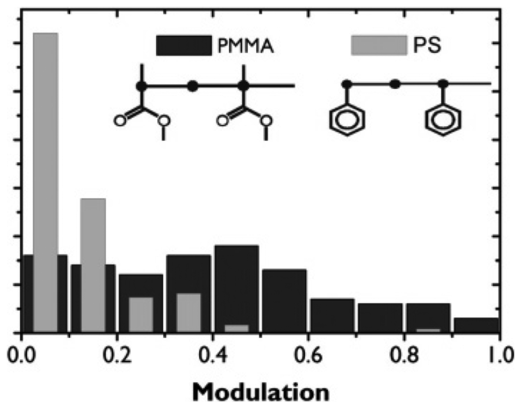 In 2006, Hania et al. studied the host matrix dependent fluorescence modulation of single conjugated MEH-PPV chains by an electric field [71]. It was found that fluorescence intensity modulations in a polystyrene (PS) matrix are on average much less pronounced than in a PMMA matrix. Figure 10 shows the histograms of the florescence modulation depth M of single MEH-PPV chains in PS and PMMA matrices. M is defined as (Imax − Imin)/Imax, with Imax and Imin the maximum and minimum fluorescence intensity of the molecule, respectively. Clearly, the modulation is much weaker in PS (average 0.1) than in PMMA (average 0.4). They proposed that electron acceptor sites in the surrounding matrix may induce long-lived charge-separated quenchers on single MEH-PPV chains, which contribute to the modulation of single molecule fluorescence. It is possible that the carbonyls in PMMA ester groups fulfill a role as electron acceptors. However, the substituents in PS are nonpolar electron-rich phenyls which cannot act as electron acceptors. Besides this, they found that the response of different molecules shows large qualitative differences, even in the same matrix. They attributed the modulation difference to differences in chain topology and strongly anisotropic distributions of acceptor sites in polymer matrix. This suggests a possibility to probe the electric field-induced heterogeneity of polymer matrices by detecting the fluorescence of single molecules based on ET.