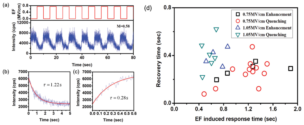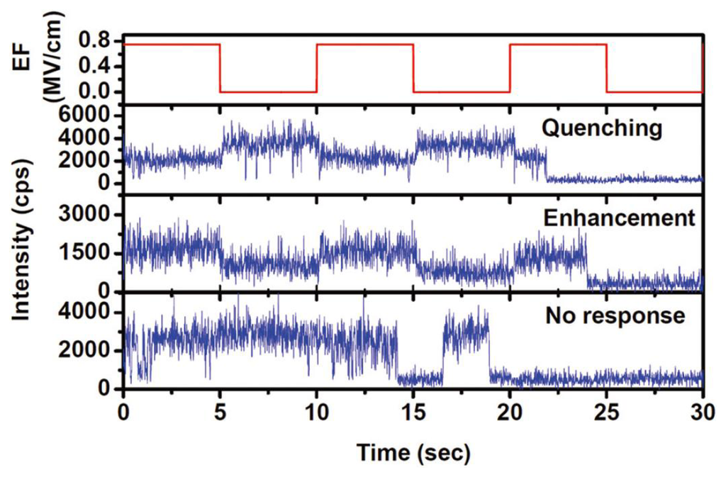 Based on the ET behaviors, single molecules have been used to probe the polarization dynamics of a PMMA matrix under an electric field. Due to the fact that PMMA is a polar polymer, two types of polarization exist when the electric field is applied: electronic polarization and orientational polarization. Both types of polarization would change the distribution of electron acceptors surrounding a single molecule. The difference is that, however, redistribution of electron acceptors induced by orientational polarization is much slower than that caused by electronic polarization. Thus, non-instantaneous and instantaneous responses of single molecule fluorescence under external electric field were found, as shown in Figure 12. When the electric field-induced electronic polarization dominates the polarization dynamics, the redistribution of electron acceptors inside the PMMA matrix is much faster, which induces instantaneous changes of the response of the molecule fluorescence. However, if the orientational polarization has a leading role, the redistribution of electron acceptors surrounding the molecules should be much slower, which shows a non-instantaneous fluorescence response. In this way, by detecting the electric field-induced change of single molecule fluorescence based on ET, the polarization dynamics of PMMA has been investigated.