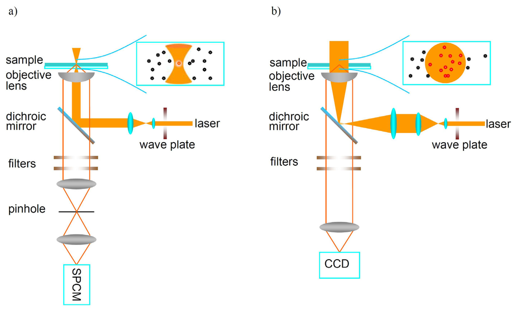 Two typical techniques based on far-field optical microscopy are used to detect individual molecules: confocal microscopy and wide-field microscopy, as shown in Figure 2. In confocal microscopy, the excitation laser is focused by a high NA objective to a diffraction limited spot. The fluorescence emitted by single molecules is collected by the same objective and filtered by a pinhole before reaching the detector to reject the background arising from matrix outside the focal spot. The fluorescence is usually measured by an avalanche photodiode (APD) which has low dark current and efficient quantum yield at the single photon level. Large area single-molecule images are obtained point-by-point by scanning the sample and the fluorescence intensity of individual molecules is recorded one-by-one. Besides detecting the fluorescence trajectory over time, one can measure the fluorescence lifetime of single molecules by using pulsed light excitation. The emission spectra of individual molecules can also be measured with a spectral charge-coupled device (CCD) combined with a spectrometer. However, the limitation of confocal microscopy is that only one single molecule can be detected at a time, which increases the detection time if a larger area is investigated. In wide-field imaging, however, large area imaging is directly recorded by a CCD. Compared with confocal microscopy, it is possible to image a number of individual molecules simultaneously in wide-field microscopy. The time resolution for wide-field imaging is limited by the frame transfer rate of the CCD to about millisecond range.